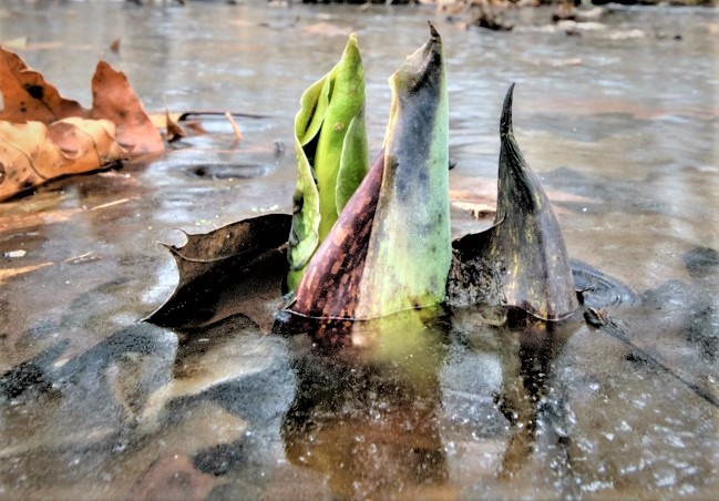 Never saw skunk cabbage before. Nice colors, I wish that oak leaf was out of the picture. I also believe the skunk cabbage can sand on its own. Nice find. |