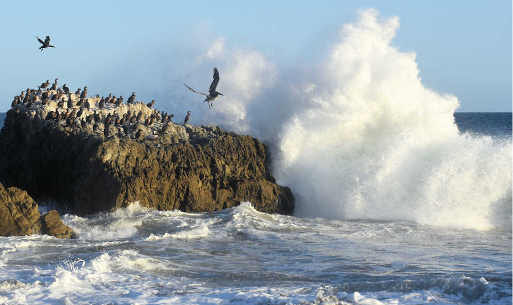 Marilyn, you also live in a beautiful part of the country. Every state seems to have its own claim to fame and is uniquely beautiful. You captured a great image. The white wave splash shows good color and depth. The action of the bird flying into the splash creats a good story. Your processing is spot on. My only thought for change would be a crop to move the bird of interest off center. In the sample I took a little off the left I felt that the smallere rock did not contribute, but the new composition carried the eye better in the pano format and retined the maine interest: the bird and the splash . Nice work. |