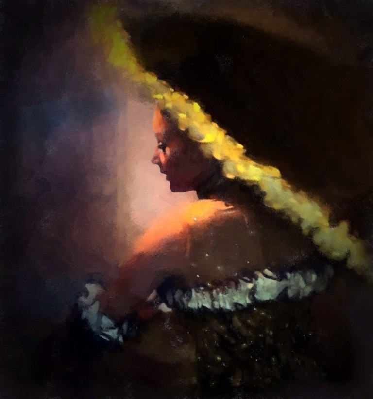 I very much enjoy the achievement made in producing this. Not only in photographic composition of the trim but also the artistic processing. The side and top lighting silhouettes the face and expression very well. The yellow fringe to the umbrella delineates the subject and umbrella well, and forms diagonals well with the fringes of the costume. The highlights on the backdrop nicely become backlighting.