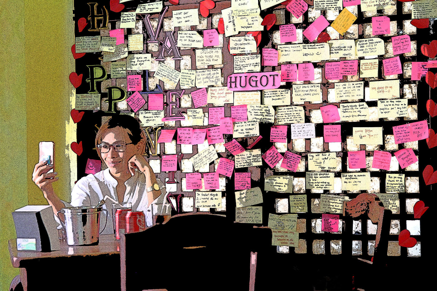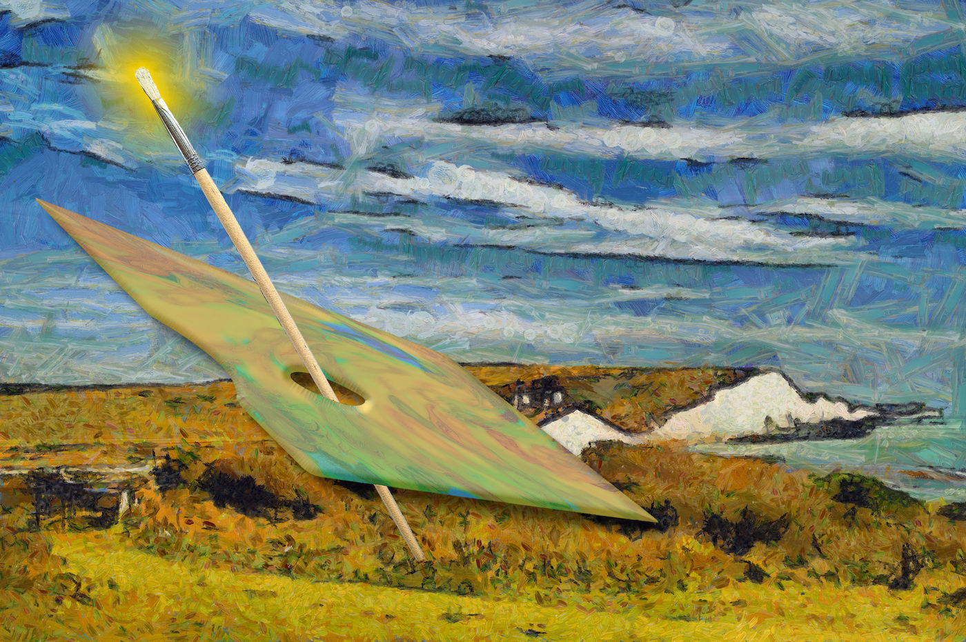 The scratchy line effect is very post-impressionistic, with even felt tip and line pen effects combined. It lends a van Gogh effect to the boats and the hills. |