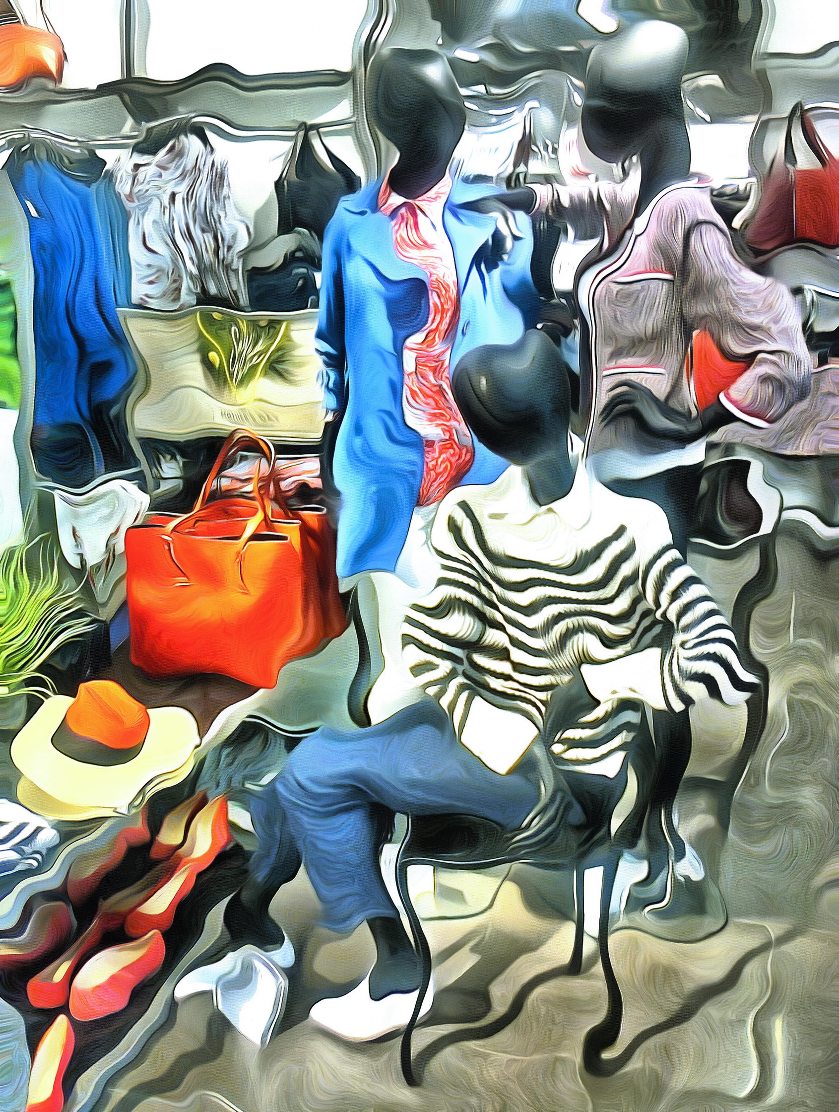 A very fine result, indeed. The slicing into columns of image on monochrome, and the muted colours work well. The graduated peach background of ? same image diffused set it well within the fframe. |