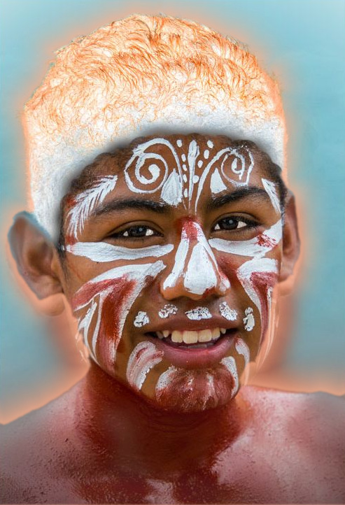 The orange would be a warm glow, to disguise the out of focus flesh.. The negative hair looks like a hat, given the black hair poking through underneath. I assumed that was the intention.