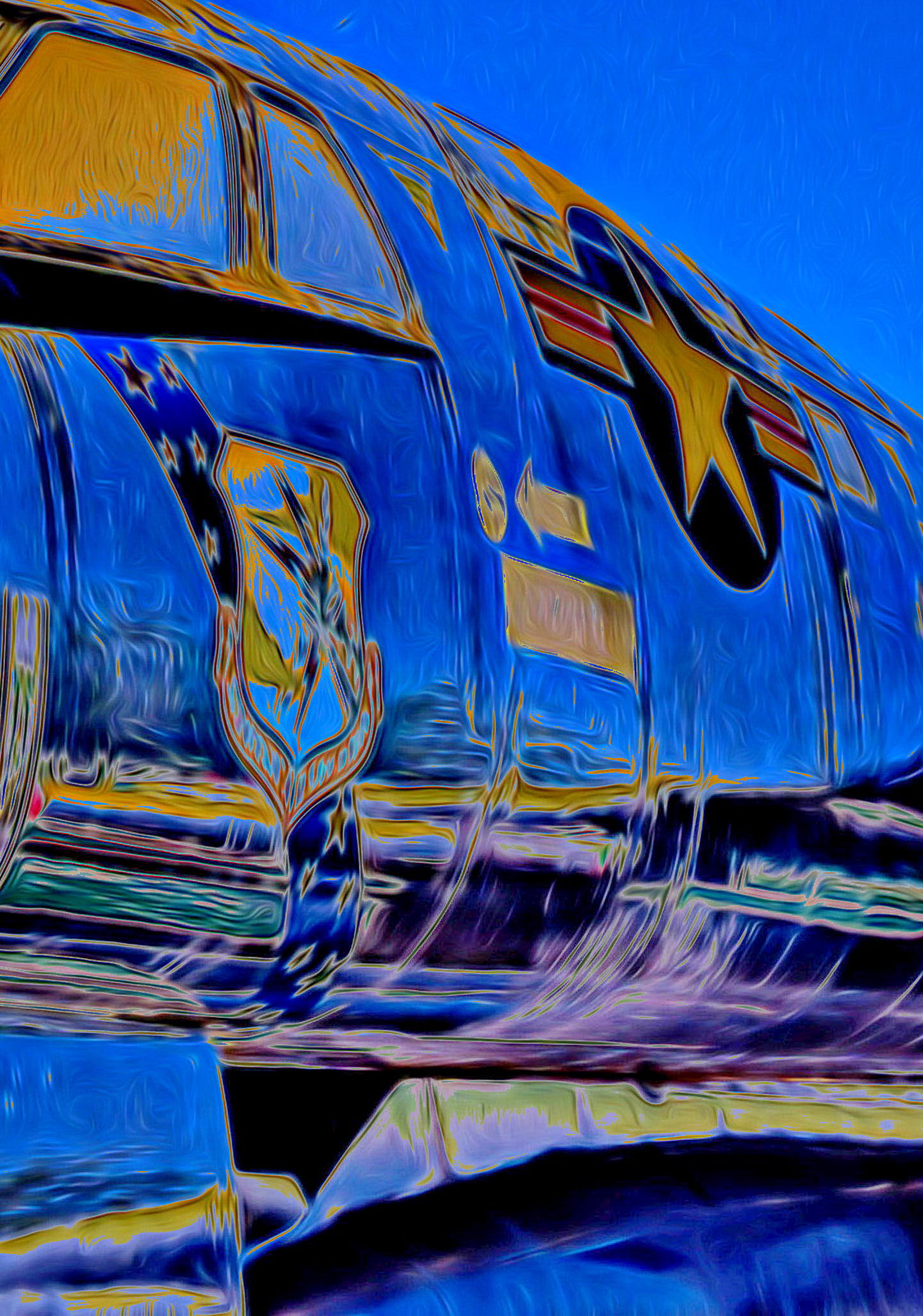 It works well with the painting filter, but in view of comments above, would it be better with a tight crop to remove some sky? A trim to vertical concentrates the eye on the emblems, with a diagonal from winscreen to engine. A touch of solarization to take it more into the creative realm leaves it looking like a sunrise, and ready for action at any time. |