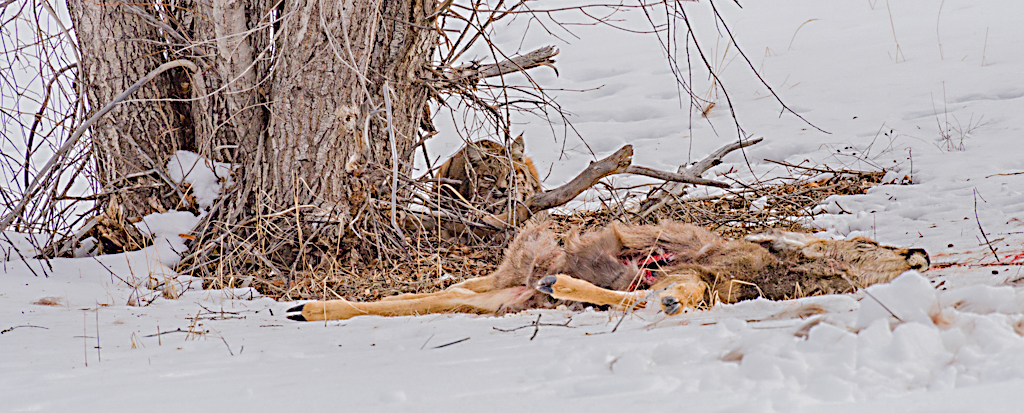 This is a very difficult situation. The snow is very bright and the lynx is in the shadow of the tree and partly hidden. I tried to open up the shadow at the risk of making it more granular. I also reformatted the picture to direct the attention more on the live animal than the dead one.
