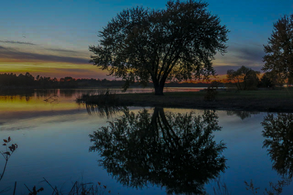 Dans ce type de situation, il est important de sous-exposer car la caméra tentera d'amener l'éclairage général au gris neutre. J'ai pris la liberté de diminuer l'éclérage d'environ 2.5 "stops". Le cadrage est bon à droite et gauche mais il aurait été préférable d'avoir un peu d'espace au dessus de l'arbre (et en dessous de la réflection). |