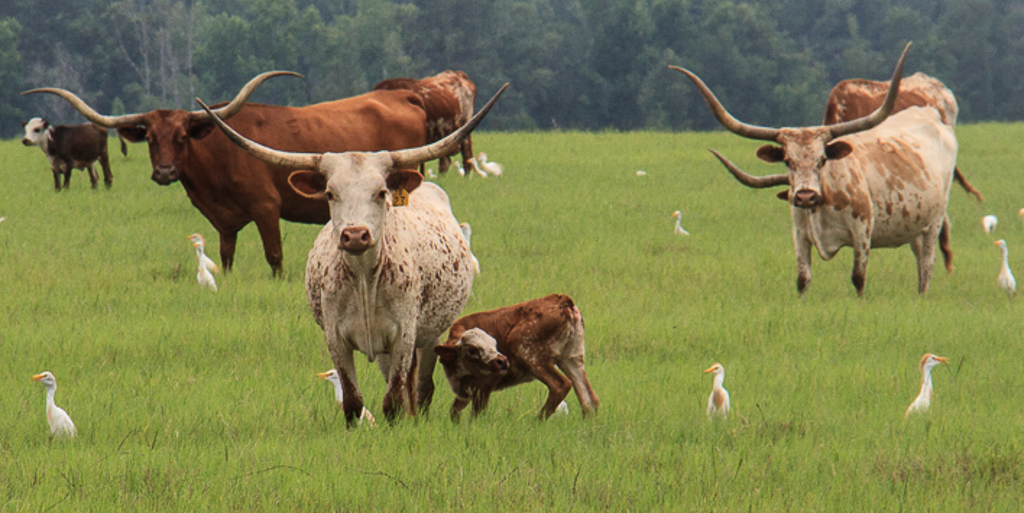 You are raising good questions: what to include and exclude in the picture. Sometimes, by staying around for a while, one could get the mother and the child looking at one another. Personally, I found that the flying cattle egret distracting and not adding much interest. I really liked the calf observing the walking egrets. Here is a version that I would favor, focussing on the mother, her calf and the walking cattle egrets. I included the other longhorn as cropping it would be rather difficult.