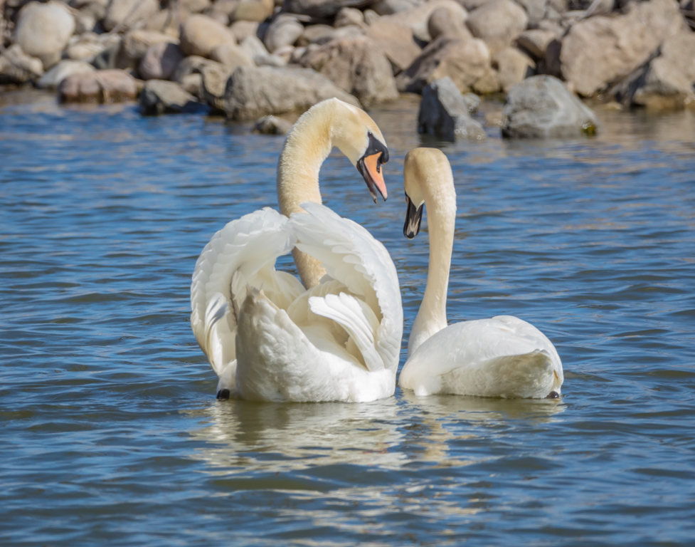 Thanks for these constructive comments. I am not a big fan of sharpening (or maybe I do not use it properly..). I added some sharpening to the left Swan on his head and remove a small white spot. Here is my new version.