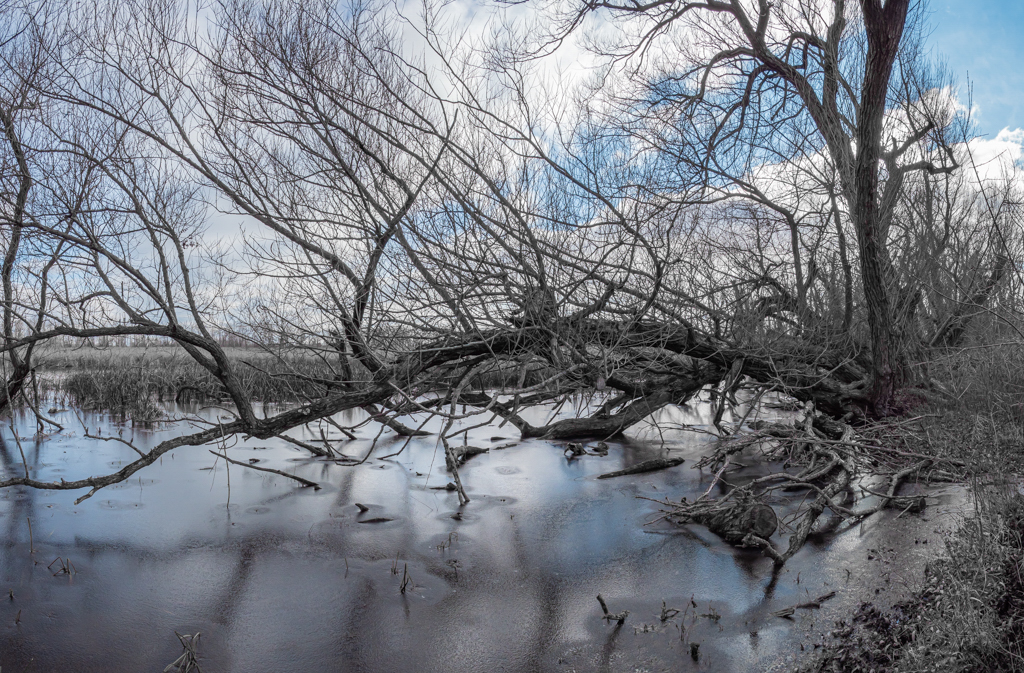 Serene scene. Lovely and relaxing. Nice color palette. As for the cropping, I prefer seeing the image with the single hole tree on the left.
