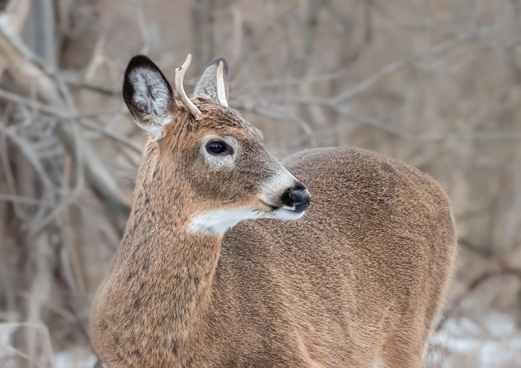 I reworked this picture. To emphasize the animal and blurr the background further, I used the brush tool (with a broad feathering) around this young buck and decreased the contrast, clarity, sharpness, and highlights. |