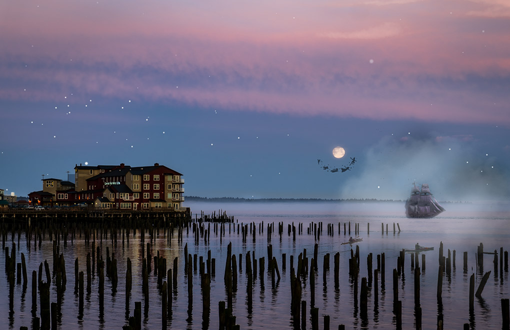 Thanks Brad! I worked on this and made some changes based on your recommendations. I changed the size of Peter and friends and didn't like the perspective change so I just changed the opacity. I made the boat clearer with a bit more fog. I'll keep looking at it with an eye to improving. |