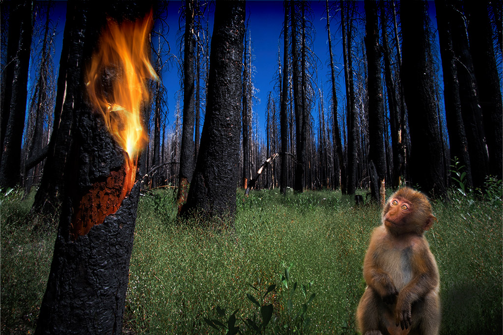 And lastly, I added a bit of dark vignetting to the top to help the eye stay in the photo because, to my eye, the blue is so intense and fighting with the focus of the monkey/fire. |