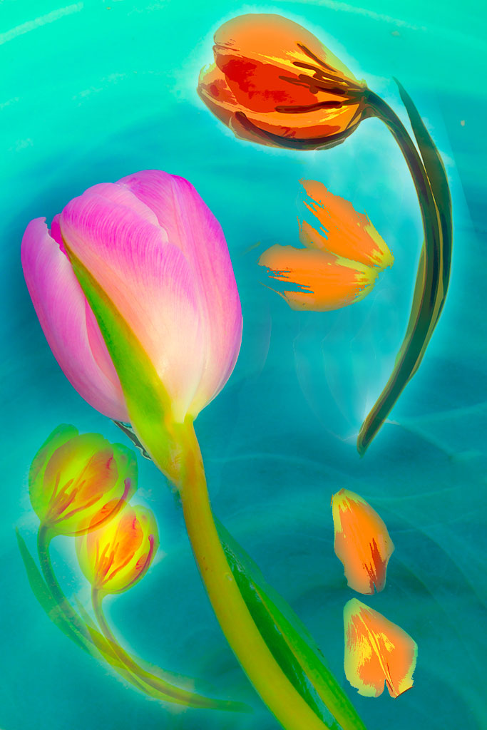 I wonder about about the placement of the two petals underneath the right tulip. It seems that they are crowded too close and create tension. (maybe you wanted to do that) and then there's an empty space in the bottom right.