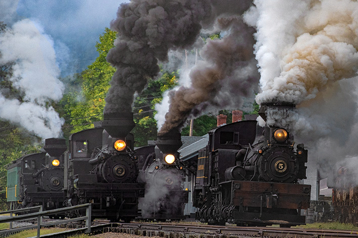 In addition to cropping out the white structure, another suggestion might be to increase the focus on the locomotives by cropping down, utilizing the Dehaze filter a bit to further increase awareness of the locomotives and to bring out the conductors in the last two trains. Great image Tom. |