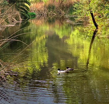 Nice springtime relaxing image offering a variety of soothing green and brown colors and reflections. I like that you were able to capture the concentric circles made by the Mergansers. In fact I might suggest cropping in to make the Mergansers your prime subject. |