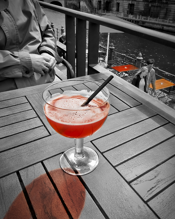 Specifically to my eye, the background is busy, contrasty and distracts from the subject (red wine glass). Here one might darken the rail and water / boardwalk to remove some of the contract and distractive quality in this area of the image. Also the reflective glare on the table bothers me. It perhaps would have been nice to use a circular polarizer filter to reduce this glare, but lacking that (what ? You don’t carry a a circular polarizer filter in your wallet ?) , processing the image to darken / reduce the glare might add to the image. Finally, the selective color adds a punch to the image and focuses our eye to where you want it, but making the shadow as red as the wine looks odd and therefore distracting. Shadows are most often darker and a bit subdued. I would suggest here that you reduce the saturation of the red and perhaps darken it a bit to make the presentation a bit more realistic. In doing this I think that the effect of retaining the red color of the wine in the shadow will be maintained, while the distraction of having a bright red spot on the table might be lessened.