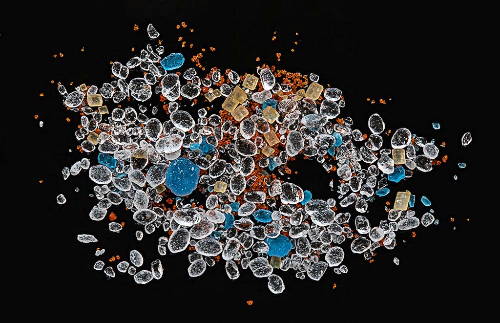 I said earlier that this was a wonderful mass of color, shapes and texture, and it is but that can also work against you. It is easy to forget our lessons in composition that still apply. You need to have a centralized subject to catch our eye and in this image you do with the larger blue crystals, but there is also a lot of subject around the edges that pull our eyes from the main story. There is also a lot of dust or very fine particles that clutter-up the scene (to my eye). One of the things that few discussions on focus stacking discusses is the need to do a fair amount of editing on the final stacked image. The stacking process really brings out dust, hairs, very fine particles and optical artifacts, and one needs to remove these to generate a clean presentation. It is not uncommon for me to spend an hour or so just cleaning up a stacked image.