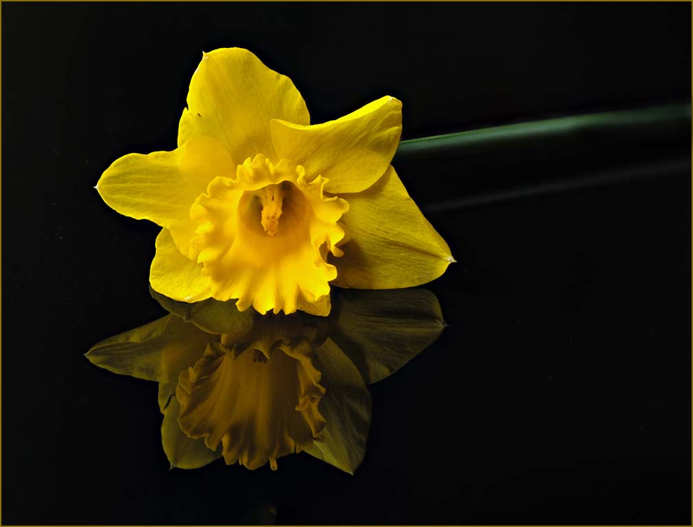 I love your image. Not only does it have great story, composition, subject and color, but with the reflection and dark background it conveys a sense of emotion as well. Well thought-out and executed. The border was also a good inclusion since now you define the border rather than letting chance provide a suitable background to bound your image.