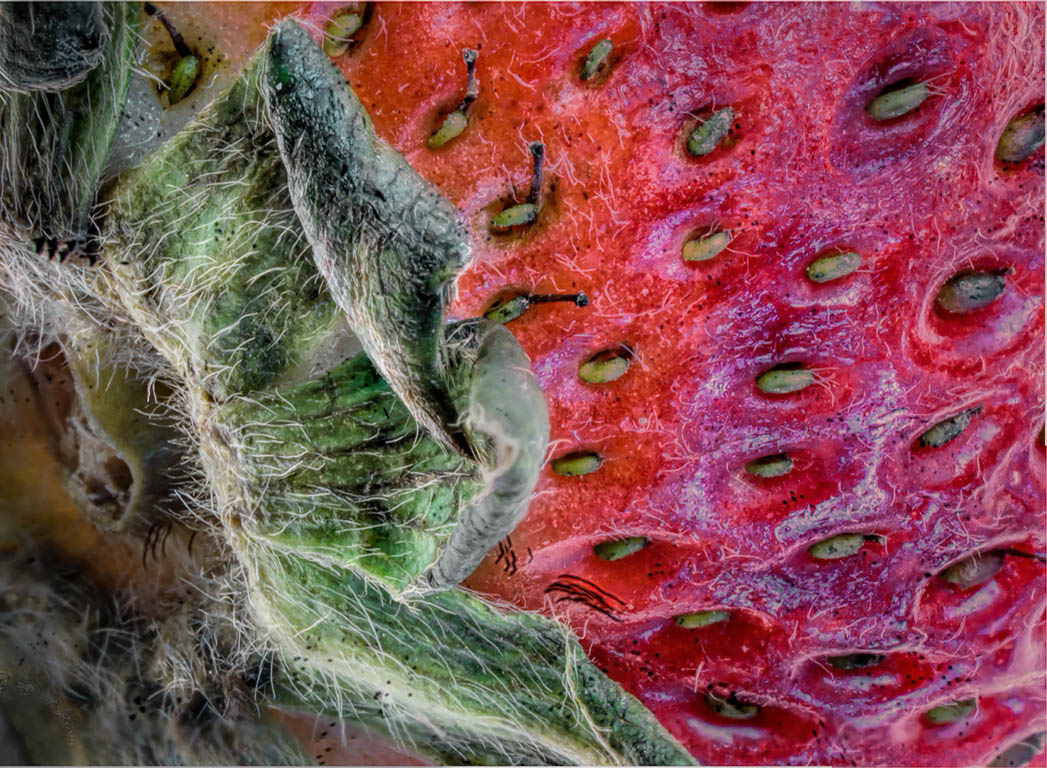 You have successfully captured a considerable amount of detail here with your application of focus stacking. However, the image appears to me to lack a sense of depth here. This is common in focus stacking, and often needs to be addressed in post processing. I also see a large amount of blue specular highlights in the strawberry with just don't seem to belong. Fortunately, these issues can be addressed in post processing. I would be tempted to select and darken the background portion of the image on the left, that being the part of the image that is behind the prickly leaf. This will allow the leaf to stand out some giving some dimension to the image. Also I would try to select and remove the blue specular highlights within the body of the strawberry (a luminosity mask would be helpful here). Finally I would enhance and darken slightly the color of the strawberry to allow it to recede slightly from the prickly leaf which appears to be extending out toward the viewer. I have applied some of these things to your image to illustrate my thoughts. See what you think!