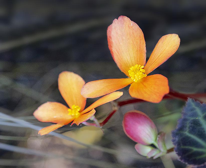 What an interesting shot you have presented to us. Lots of vibrant colors and shapes with several clearly identifiable subjects. My eye has no problem going directly to the sharply presented orange bloom. I do feel a bit of tension in the composition as the orange bloom is on the upper quadrant and is radiating upward and quickly off the image. Perhaps that was intentional. I do get the sense that the image is a bit busy. First you have two distinct and separate points of focus, being the orange bloom and then the leaf in the lower right quadrant with its bright and sharp edges. I tend to bounce between these two elements which is a bit detracting. Add to this the bright light horizontal lines, and the bright spots in the background and the busyness abounds. In the attached image, I addressed many of these concerns. While I am only so-so with this result, it does serve to illustrate some of the points in my comments. I do appreciate though, that these edits may have taken the image away from your original vision, so I only offer this for illustrative purposes, and not to suggest that it is "better". |