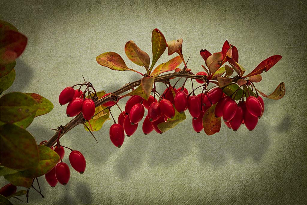Barbara - Your images keep on improving and this is no exception. Creating effective still life images is an advanced skill, and one that you seem to be recently embracing. One of the keys of effective still life images is to capture a fall-off of light across the subject, and you have successfully done so here. I especially am enjoying the shadows cast by your subjects. I think that your composition and use of a framing elements were well thought-out and your choice of texture and background effective. The vignette also enhances this image. I do feel though, that this image is a bit dark, in that we are losing some of the detail and impact of the berries. Here I might be tempted to lighten the entire image a tad (another one of those technical terms), and perhaps bring out the shadowed detail in the berries (not the shadows cast by the berries). In doing so I think that the subjects are brought to life a bit more, and we can more fully appreciate both the subjects and your vision. I have included an example of these types of edits to illustrate my thoughts. Nice Job! |