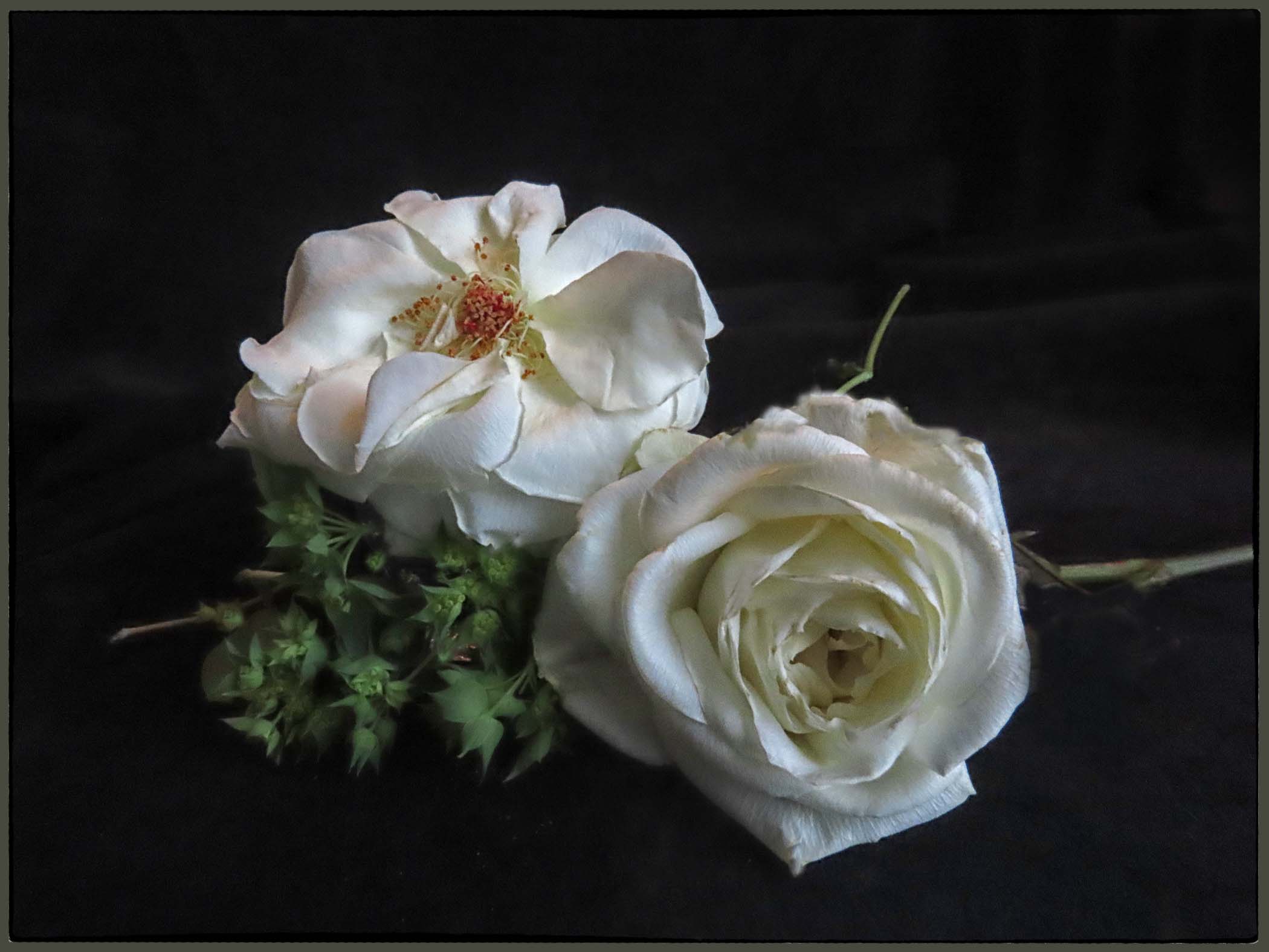 Here you give us yet another artfully constructed still life. The composition is effective, and here two blooms work (and "rules" be damned). Your lighting really enhances the scene allowing a gentle softness throughout. I am especially am enjoying the subtle depth-of-field employed as there is sufficient detail within the roses, while the bit of softness in the stem and greenery. All, in all, a great effort. That being said, I feel that your choice with the stark white border unfortunately disrupts the overall feel of the image. It adds a starkness to the image which directly counteracts much of the effect you were going for. Adding the border is not the issue, but the bright starkness chosen here. I would have employed a softer gray or khaki color here, perhaps pulled from the color of the stem in the background. This would allow the border to blend in more into the presentation without dominating the presentation. I have included an example of these types of edits to illustrate my thoughts. Aside from this though, and wonderful image. |