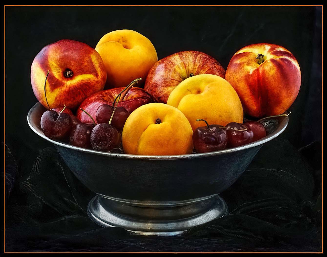 I was impressed with your effort here. Even though they look relatively simple, still life images are some of the hardest to do well and require an expereinced eye to gage and capture the light in the most advantageous manner. In fact, the gentle fall-off of light across the scene is one of the hallmarks of an effective still life image, and seeing and creating this is an advanced Photography skill. In your image your have captured a wonderful scene with a lot of interest. The composition and colors are all effective. The lighting though is a bit harsh, with hot spots on the fruit, some washed out loss of detail in the fruit and almost no detail in the bowl and background. It appears here as though the fruit are floating on top of a bowl of blackness. These are some of the things that one needs to look for as they collect these images. It takes far less light that we might expect. Here I would bring out the detail within the bowl, background shadows, and in the cherries. I would also clone out many of the hot spots that we see in the cherries and in the fruit. I would also work to reduce the brightness we see in the base of the bowl. Finally, as you bring out the shadowed detail in the bowl and background, you will also need to remove a fair amount of color noise and many additional specular highlights that might now emerge. I have included an example of these types of edits to illustrate my thoughts. |
