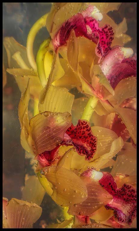 You have given us quite a novel image here. I am enjoying the undulations of the submerged blooms within the liquid and the interesting distribution of the red flower parts (getting real technical here) throughout. The entire image has a muted and somewhat soft feel, and that is not surprising since the blooms are submerged. But let me ask, do you need to retain that feel with this image? If this were my image, I would be tempted to darken the background and to add a bit of micro-contract to the actual blooms to enhance the shapes and color, thereby sharpening the presentation some. I have included an example of these types of edits to illustrate my thoughts. Also, I will ask does the black border add to this image? As this image is presented, it is already on the black background, so adding the black border only serves to reduce the effective image size. |