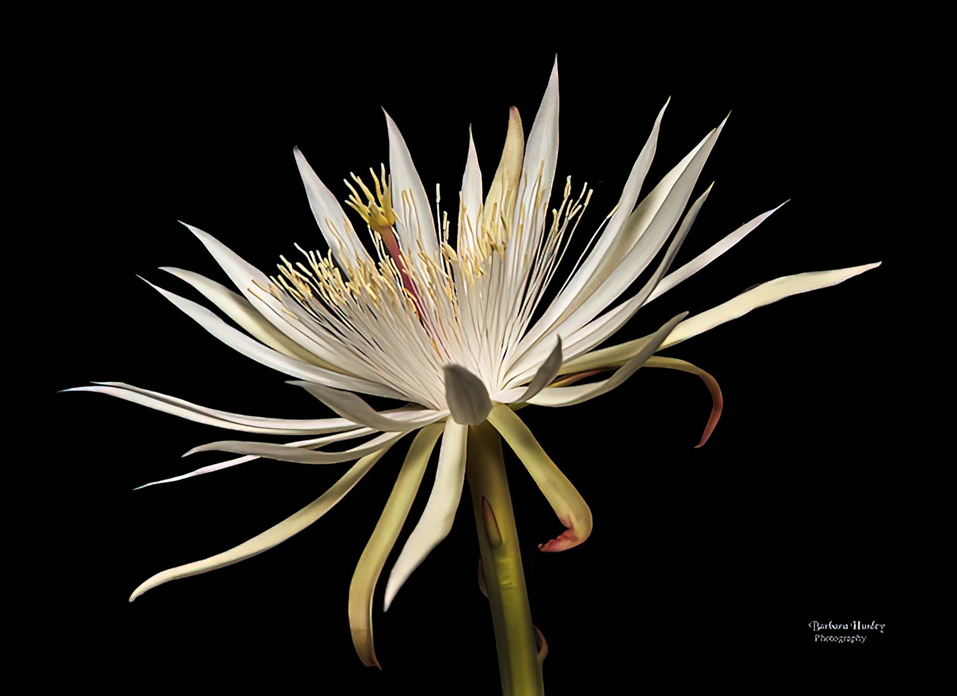 What an interesting story behind this capture. Both the bloom and the maker have their parts in this "mini-saga". In regard to the image itself, it's a classic presentation of this bloom, and I mean this in the positive sense. Your composition against the dark background highlights the bloom effectively. There is a clean and uncluttered feel to this image which I appreciate. To my eye it is a bit over exposed, and reducing the exposure slightly and adding a bit of contrast will bring out a bit more of the native detail and beauty that you have successfully captured. It also appears that the bright stem is beginning to compete with the bloom's petals so here I might suggest darkening the stem some as well. I have attached a version which illustrates my thoughts. This is a wonderful capture and rendition of this bloom, and with just a few minor post processing tweaks even more of the captured radiance of this bloom might emerge. |