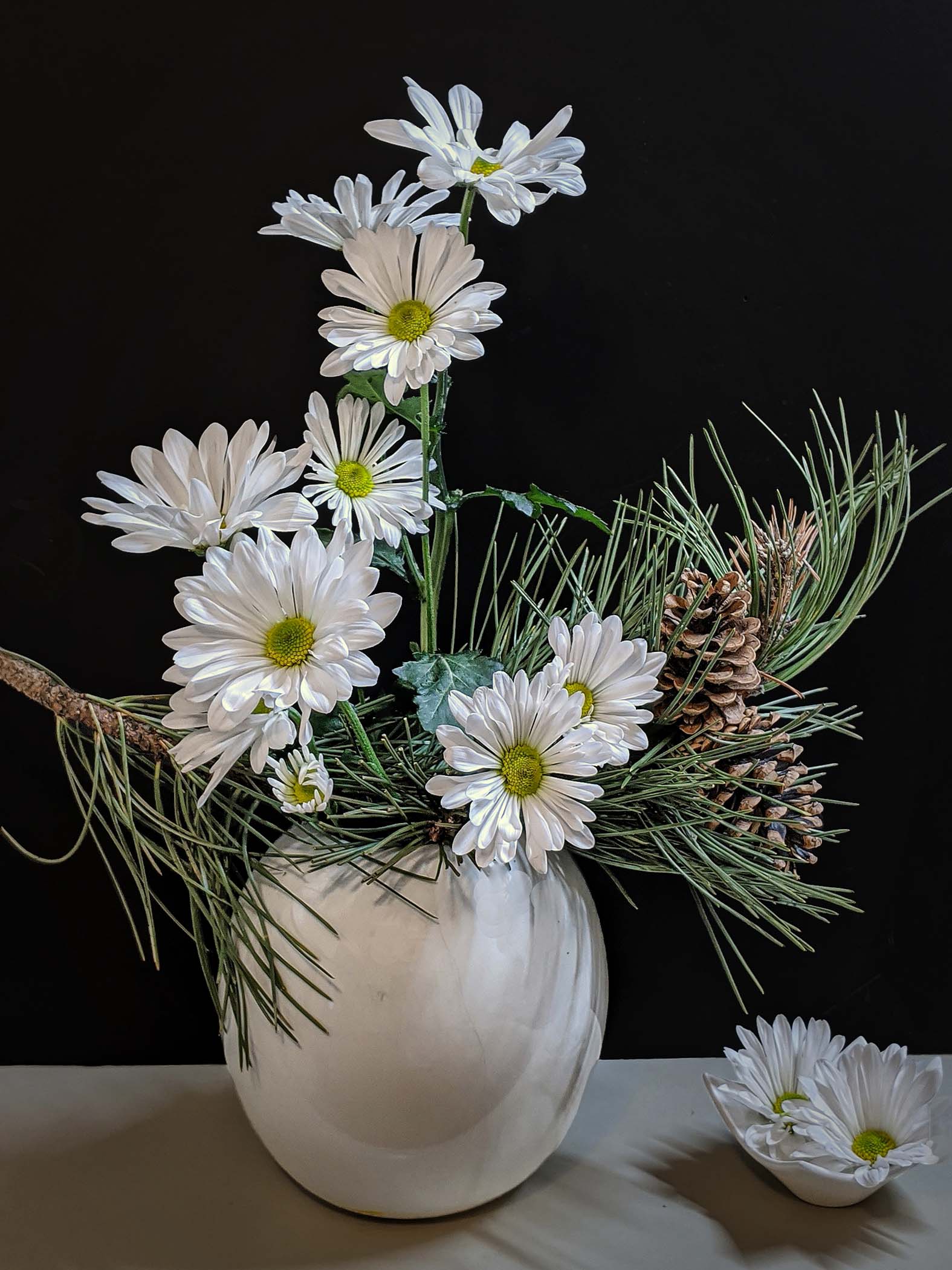 This is an effective still life of these flowers and vase. The bloom and greenery arrangement and composition is nicely done and shows off the blooms effectively. There is a simplicity to the presentation that is aided by the clean background. Now we need to bring it to the next level, by reducing the odd discontinuities and muted feel within the background. Here I might suggest darkening the background considerably and to darkening the base a bit. This would allow the subject to standout even more that it does currently. I have included a version which demonstrates my thoughts … |