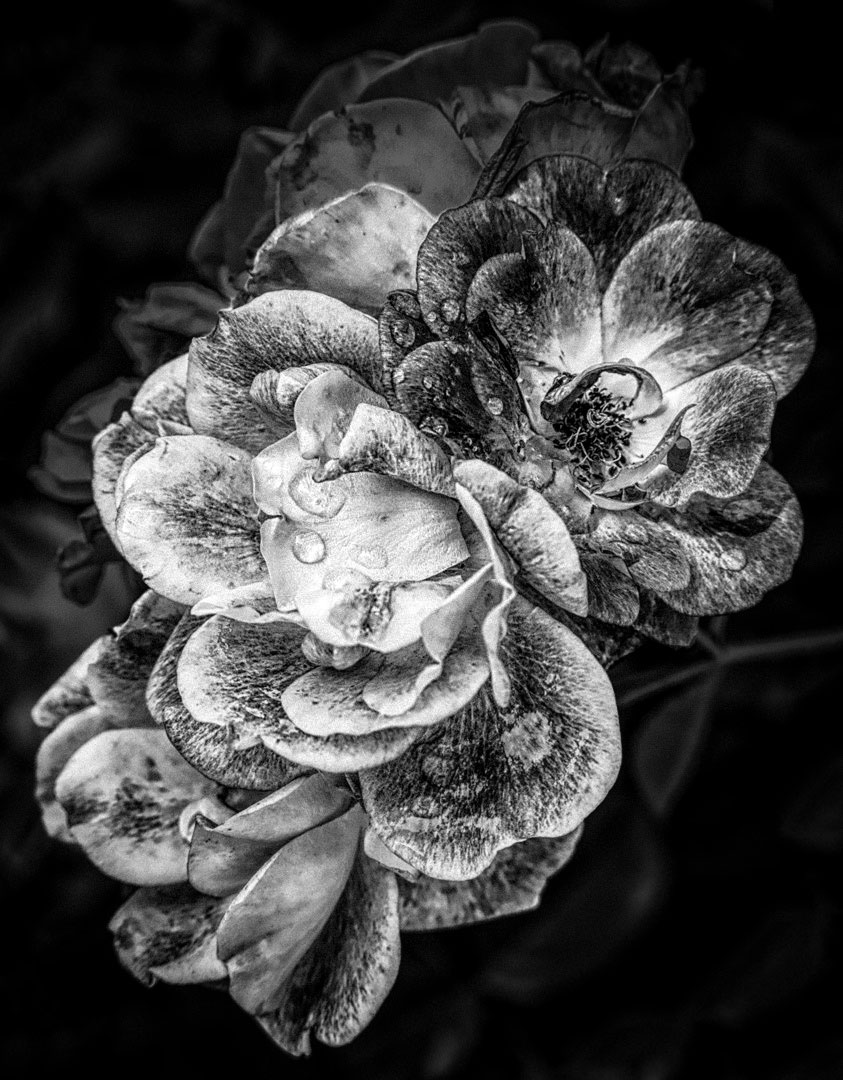 I am enjoying the texture and detail associated with this image. The drops on the petals also adds a lot of interest. The composition is quite effective, but I do feel that the primary bloom is merged with a bloom behind it, and as such in losing some of its impact. Here I would selectively dark the background more, and slightly darken the secondary background bloom to attain more separation of your main subject. The whole image does appear a bit overly-soft as well, so I would sharpen the image a bit to correct this as well. I have included a version of this image in which I illustrate these thoughts. |