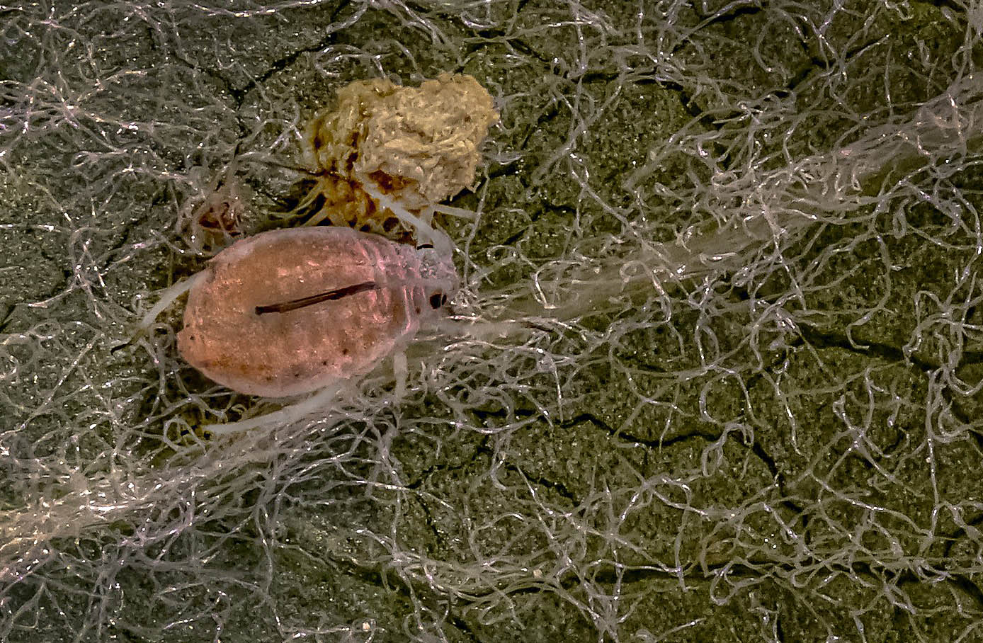 This image is less about the mite itself, and more about the mite and the environment that it lives in. as such, the relative proportions of mite to background are appropriate. We don't see a lot of the mite detail, but that's not really essential here. I might suggest that you don't need quite as much of the surrounding background to tell this story though, and cropping in so from the bottom and right might be helpful. This retains the story and emphasizes the mite a "mite more" (if you pardon the pun). I also suggest that if you clone away a bit (some but not all) of the thread that is falling across the mite's eye, this might increase our interest in the bug. I have included a version of this image in which I illustrate these thoughts |