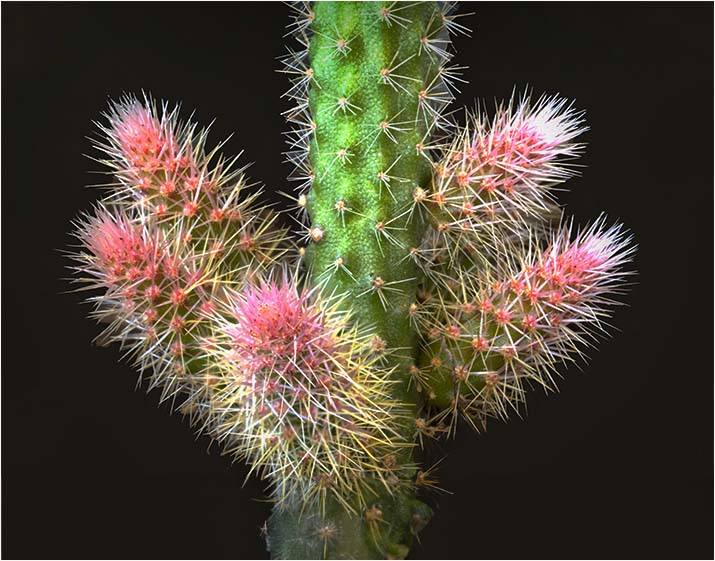 Interesting image and a wonderful subject. Lots of interesting detail and shapes. As noted earlier here you captured a nice pallet of colors and shapes within this image. Given the shape of your subject (as you noted in your response to Muphy) composition was a challenge, and I appreciate the direction your decided to take. Here the crop looks a bit aggressive at the bottom, and you might consider allowing a bit more of the stem to show below the branchpoint. Also employing a vignette at the top and bottom may help to focus the viewer's eyes to the more interesting parts of the catus. These two suggestions are ment to aid in focusing the viewers eyes away for the forced crop that was required here. Finally, may I suggest adding a bit of contrast to the image, bring out some of the native colors that attracted you to this subject.