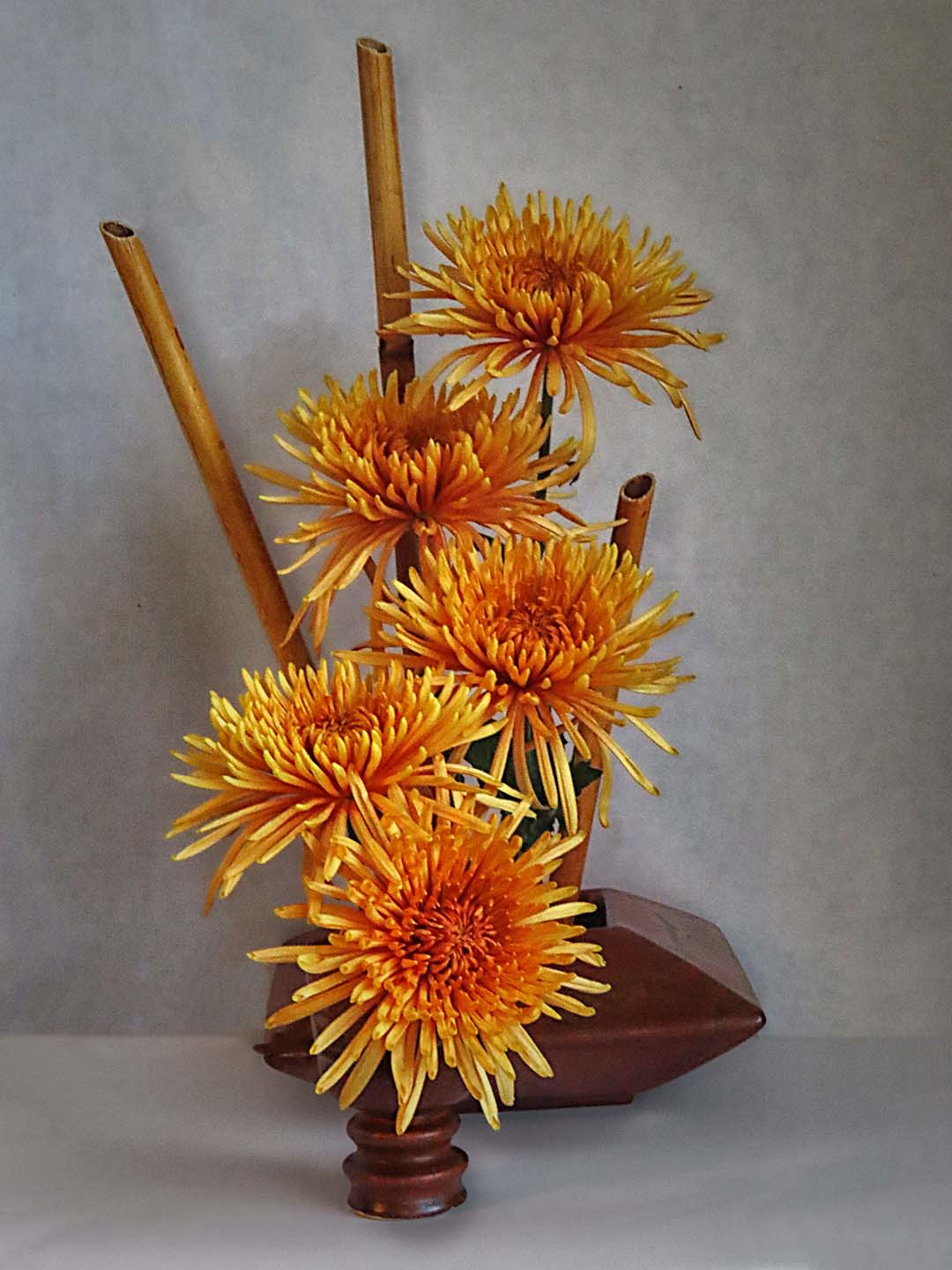 What a fun still life image. As noted in earlier sessions, these images are far more challenging than one might expect. Here you have done a wonderful job in highlighting the blooms with soft front lighting. Only a hint of back shadows are present. At times using a bit stronger side lighting adds more depth to the image, but that need not always be the case. Here I might suggest darkening the background slightly to bring out the blooms a bit more and correcting the horizon line between the table surface and backdrop some. As shown here, it's a bit ragged. Also, the color cast on the table surface is a bit odd and might be addressed. Finally, you might consider sharpening the blooms some. I have included a version where I have done these things to illustrate my thoughts. Overall, though quite a pleasing image. |