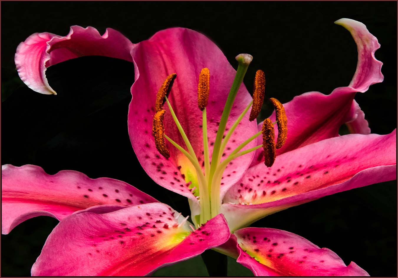 Quite a striking image. I like what you did to replace the distracting background with a clean dark pallet. This really places the emphasis upon the bloom and allows the native colors to shine. The image is nicely composed within the frame and the bloom is as sharp as it needs to be. I realize the utility of adding the pinstripe border here, but to my eye the bright red color is now competing with the bloom and is becoming a bit of a distraction. It is true that it is effective to choose a border color from the colors within the image, but such that it dose't become too noticeable. I had included a version here which modifies the intensity of the border color. I suspect that in this example the separation value of the pinstripe border remains while not being too prevalent. See what you think … |