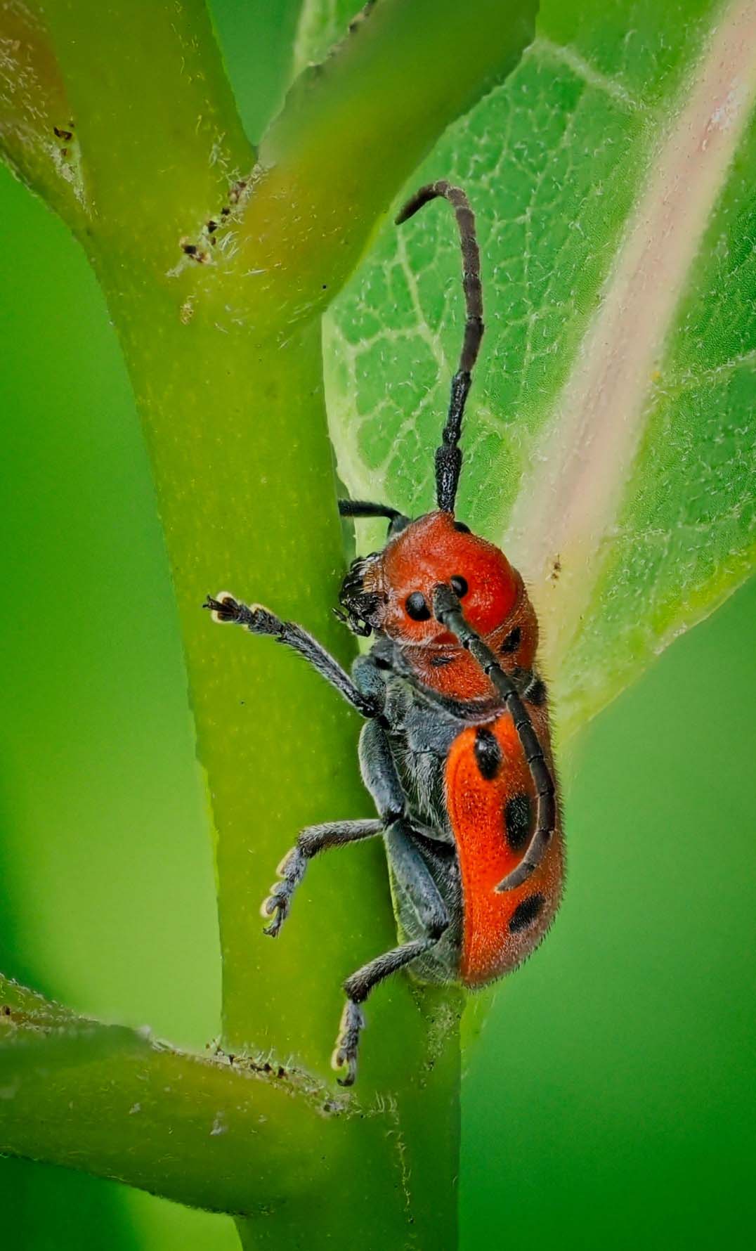 What a fun image. Great detail and composition. The color pallet of red/brown bug against a green background is very effective. I do find that the stem of the plant is blending into the background, giving a sense that the bug is floating some in the image. May I suggest selectively darkening the stem the beetle is sitting on to separate it from the surrounding greens. In doing so, the subject may now appear a bit more anchored to the scene. I have included a version of this image in which I did this, to illustrate my thoughts.