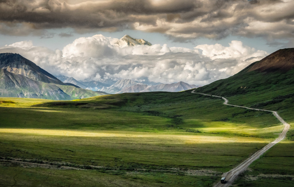 The place is a wonderland and the lighting superb! Excellent capture from the window of a tour bus. The horizon feels as though it is rotated based on the tilt in the cloud cover. While I had your image up in Photoshop for a rotation (losing precious geography in the process!), I also added some contrast to the distance through a mask. One would perhaps prefer that the road were located more to the left so that it might better align its far end with Denali's peak peeking through the cloud cover; but, from a tour bus window who is going to complain! |