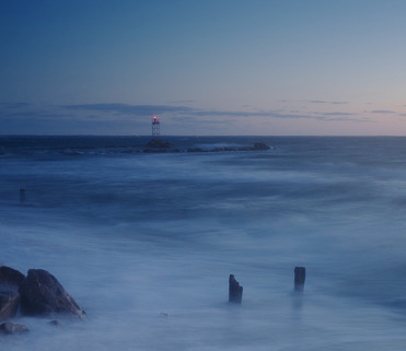 The slow shutter produced a very nice effect and mood to this image out in the edge of the surf. The rising sun just off the right edge shifts the visual center of mass of the composition in that direction. Perhaps a useful variant of this particular composition would be something like the attached image, which lines us the old pilings and distant light roughly along the diagonal. |