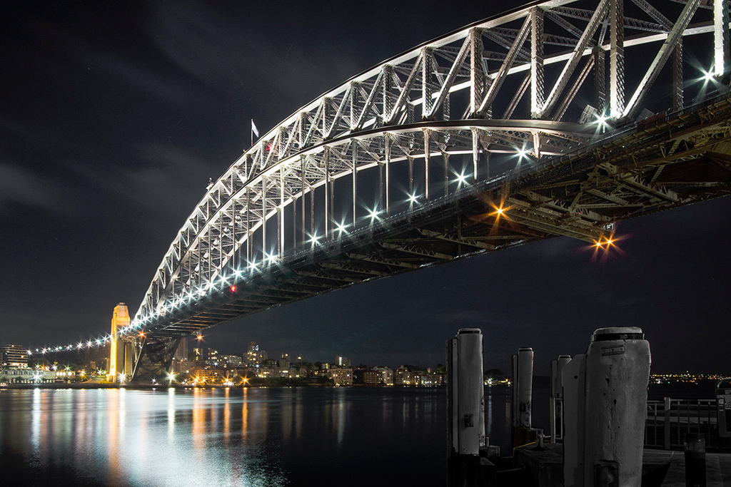 There are some really good points and suggestions from my predecessors on sharpness. The importance of sharpness of the city lights cannot be overstated in a night cityscape image, IMHO. The appearance of the pilings in the foreground here is unfortunate, though possibly unavoidable in getting this otherwise remarkable shot. In a few minutes of trying an idea or two in Photoshop, I found that the warmth of the light on the pilings contributed disproportionately to their presence. Using a decolorizing brush applied through a mask on the pilings and walkway, followed by burning of the highlights made good headway in reducing the presence of these unwanted elements. You could further reduce their weight by more burning, but I will leave that to your sound discretion. |