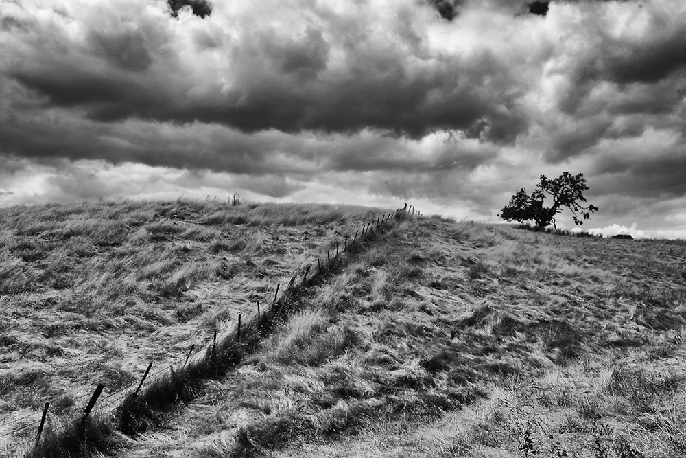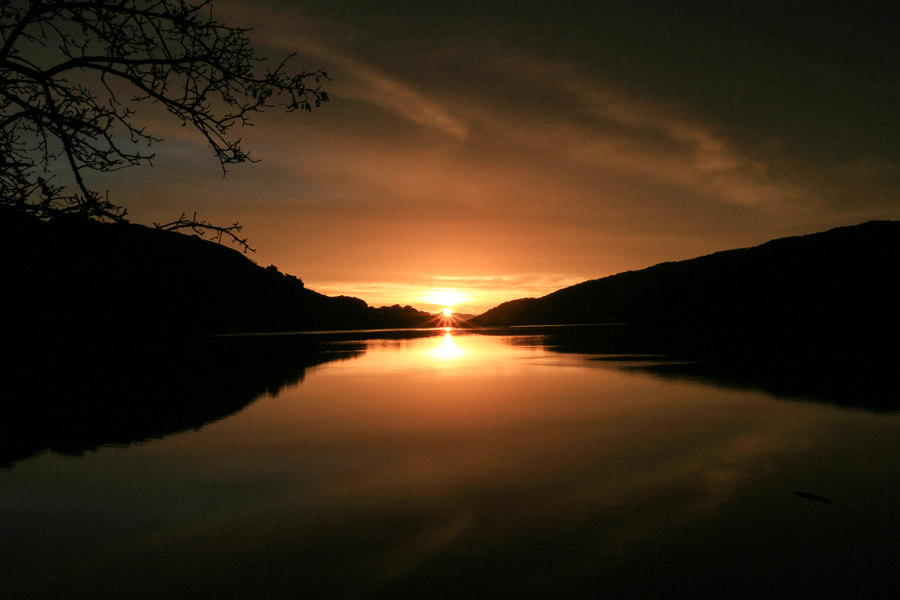 The background on this image is very nice with the belt of mountains on the horizon and the mountain peak just in view behind the tree, and the colorful, low cloud wisps.Very nice!