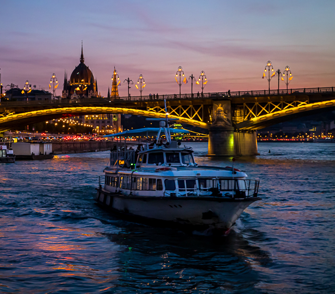 You have done a nice job in capturing the night lights of Budapest. Your strategy of starting with more exposure than desired seems to have kept the noise level to an acceptable one, looking over your original image. Sometimes "less is more" in a composition, and with this in mind, I tried out elimination of the six story building on the left, which to my eye better emphasizes the stronger elements of the scene here. Also, I dodged the bow of the oncoming boat just a bit to improve its presence. |