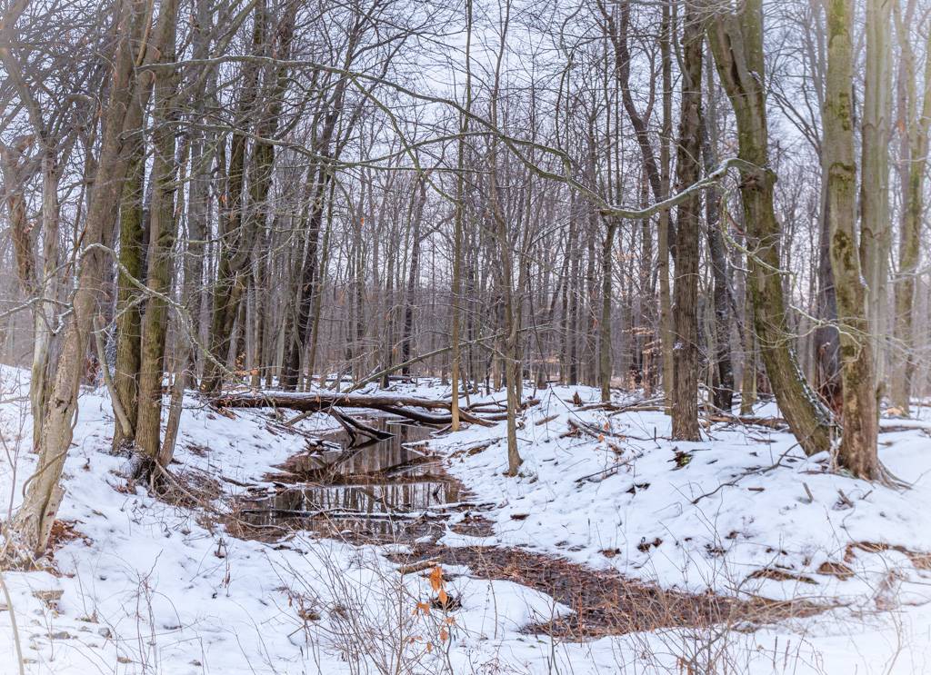 This presents a tranquil mood. I like the curve in the stream. Here's a little different approach. It's the bottom branches that I find a bit distracting. We need them in there to keep the balance of the stream and composition. I thought perhaps just applying a little lightening vignette to bring down the contrast in the area. Just another idea to play with. |