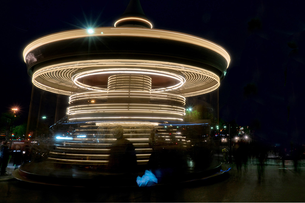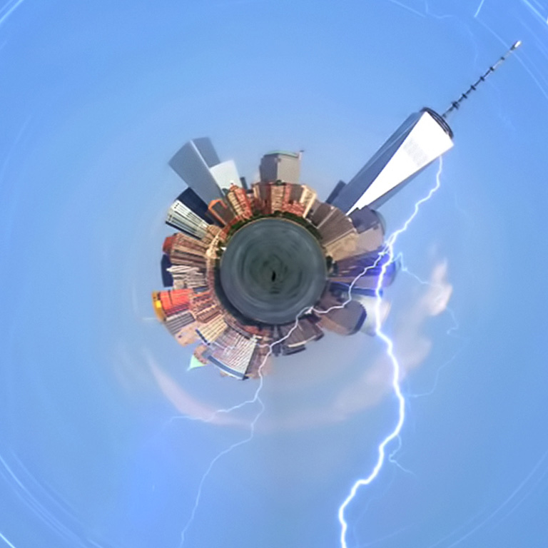 Truly, this reminds me of a phonograph record. I find the lightning bolts distracting and their placement more planar rather than spherical like the skyline. Definitely too much blue which overloads the eye and takes away from the actual subject and the skyline needs to be sharpened some. |