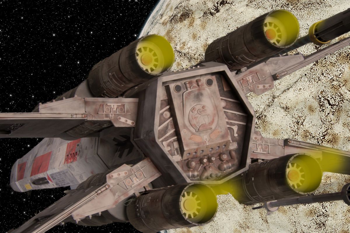 Excellent. Can't think of anything to suggest to improve this. I'm sure the original surroundings didn't work real well to sell this, but your treatment turns those surroundings into something plausible with the x-wing starfighter. Bravo! |
