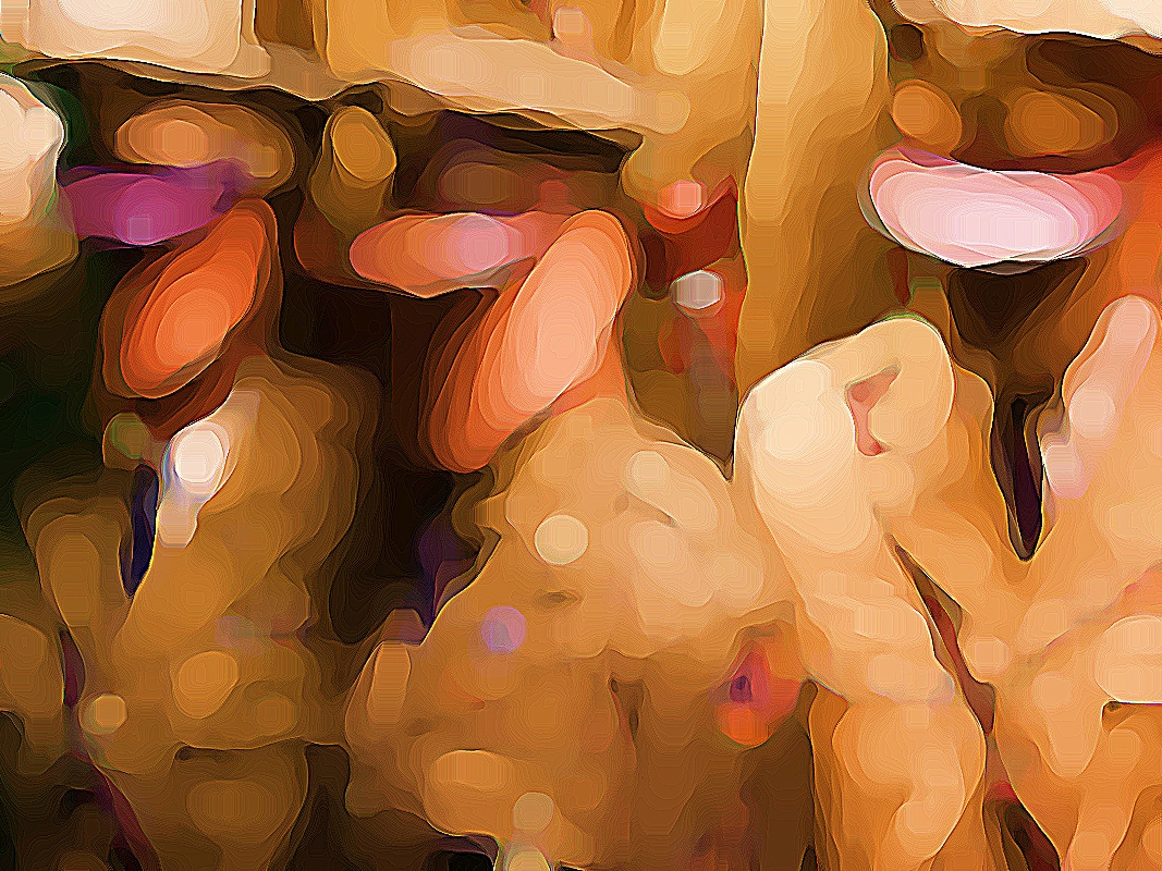 I do like the colors and tones here - the palette is very pleasing. At first glance, this image seemed very abstract to me. Within a few moments, the soldiers came into focus - almost like one of those Magic Eye images. This is not abstract enough to be studied comfortably as my mind is working very hard to decipher the elements into recognizable objects - such as the holster of a soldier just to the right of the middle head. Perhaps you would be better off going more detailed or more abstract, but not in this middle ground. Here's a rendition that attempts more abstract: |