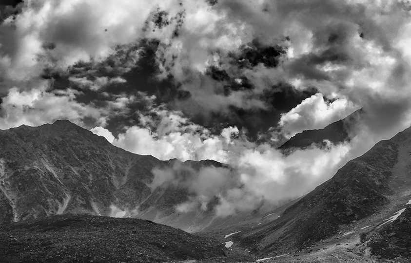 As Allen said, the green and blue in the original soften the mountains for a better story. I feel the intensity of the clouds needs to take center stage in the monochrome version, so have cropped out the foreground buildings so they do not distract. What do you think? |