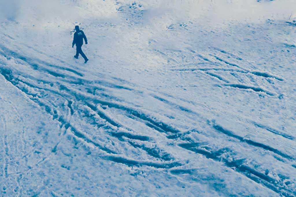 There are several scenes contained in this image, which, as a whole, makes it difficult to find a point of focus. There's the road scene in the upper left, the building in the upper right, and, as Arabella pointed out, the tracks in the snow. I, too, found the tracks very interesting, so edited a rendition to focus just on that, leaving in the walking man as a scale reference. What do you think? |
