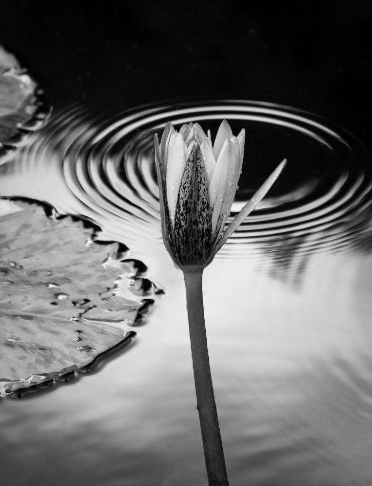 I am a tiny bit bothered by the flower's position in the composition, as it is close to on center, but not on center or at a third line. Without the ripples, a bit of cropping on the right would have made for a stronger composition. A slightly different position for this shot with the ripples would have been better. Because the ripples become a third element of the background with the 2 lily pads, the placement of the flower - visually the subject (title notwithstanding) - becomes very important.