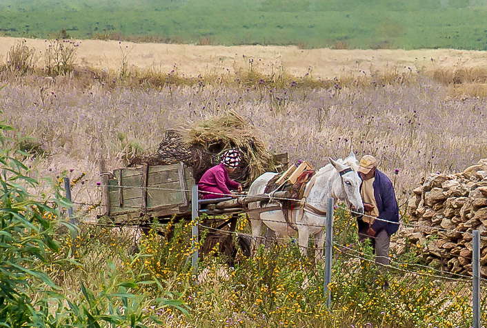 I would suggest cropping much of the image out to concentrate on the main subject. You could also consider removing some of the background distractions to better focus the viewer on the farm couple and their wagon. |