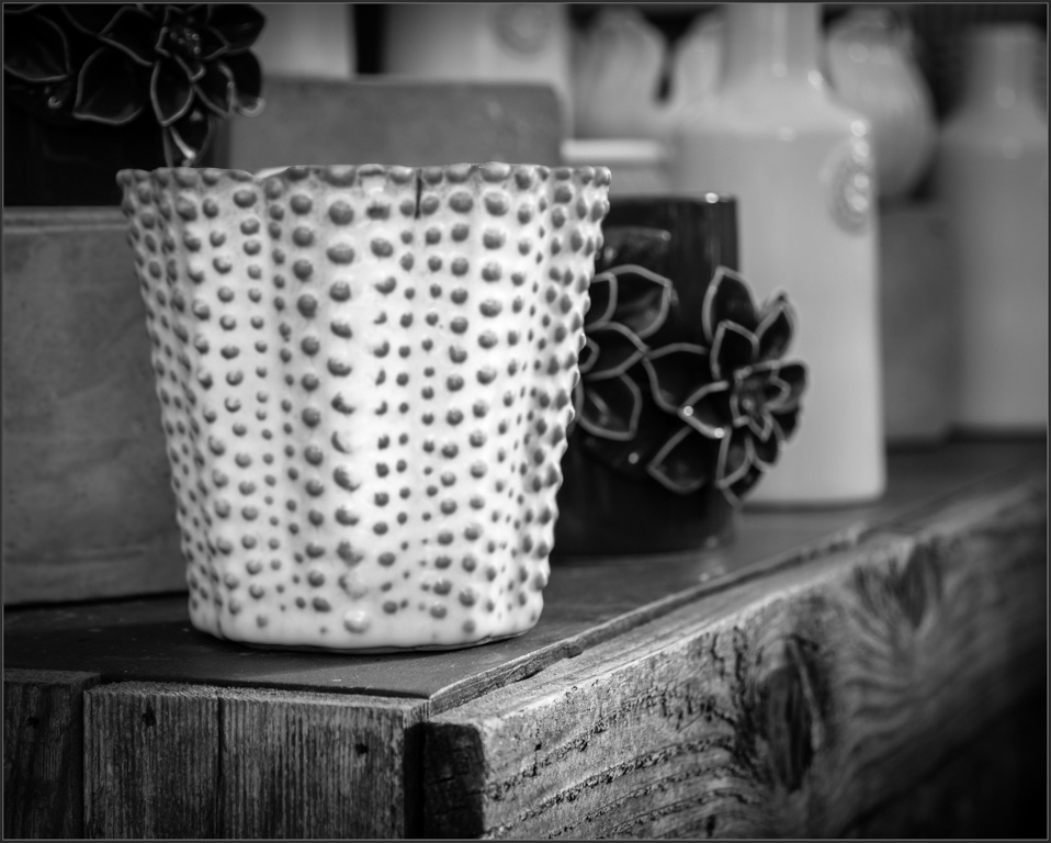 For me, the DOF is too shallow, with the black vase just behind the front vase just soft enough to be somewhat distracting. The white vase in front is the literal focal point but doesn't tell enough of the story and the softness of the rest does not support the story.