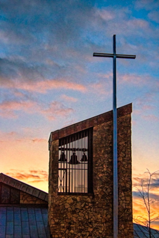 Adding contrast to clouds must be done minimally or artifacts will begin emerging. You succeeded in smoothing out the artifacts somewhat, but it didn't take care of the haloing around the cross and along the top edge of the steeple. |